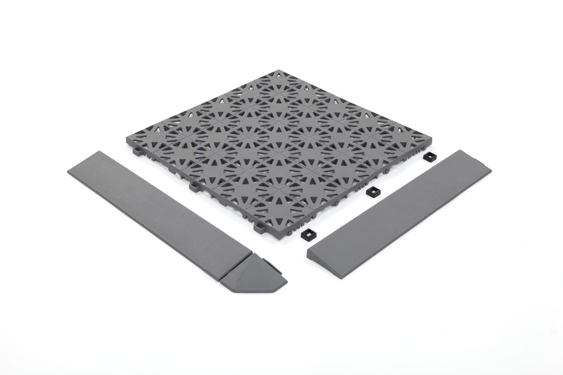 Univerzální podlahový nájezd s rohem pro typ dlaždice Hestra umožňující plynulý nájezd či přechod na podlahu. Tento typ příslušenství využijete v případě, kdy chcete pohodlně vjíždět do své dílny, potřebujete udělat z dlaždic pracovní ostrůvek, nebo využijete dlaždice jako výstavní plochu pro vaše produkty. Zakončením podlahy pomocí nájezdů dosáhnete dokonalého a uceleného vzhledu celého prostoru. Nájezdy s rohy jsou vyráběny ve stejných barvách k příslušným dlaždicím.