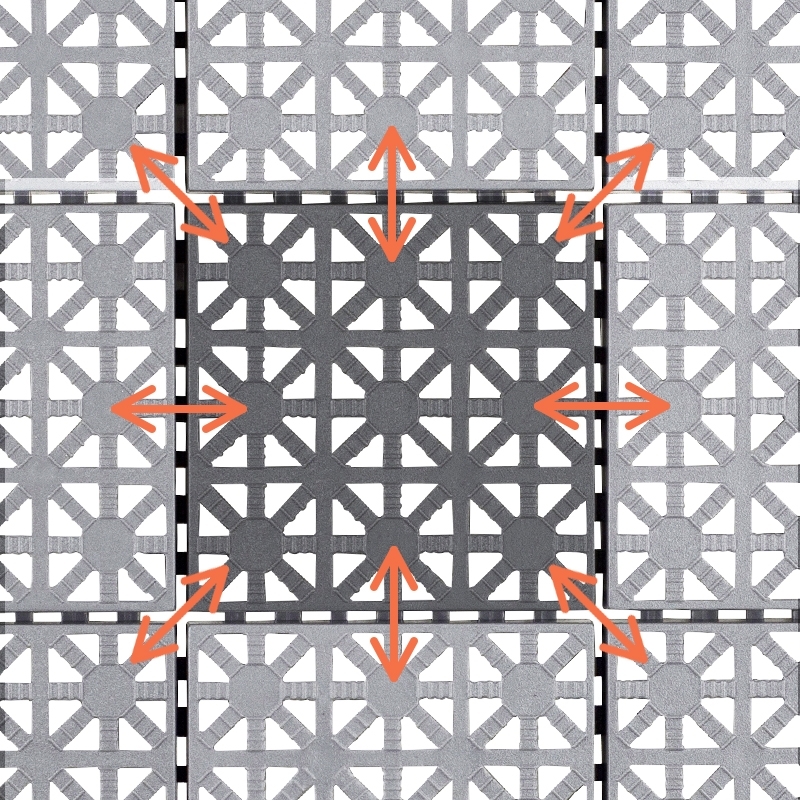 - Díky tloušťce 12 mm dlaždice účinně odvádí veškerou vodu. Inovativní, vícesměrný třecí vzor zabraňuje podklouznutí.