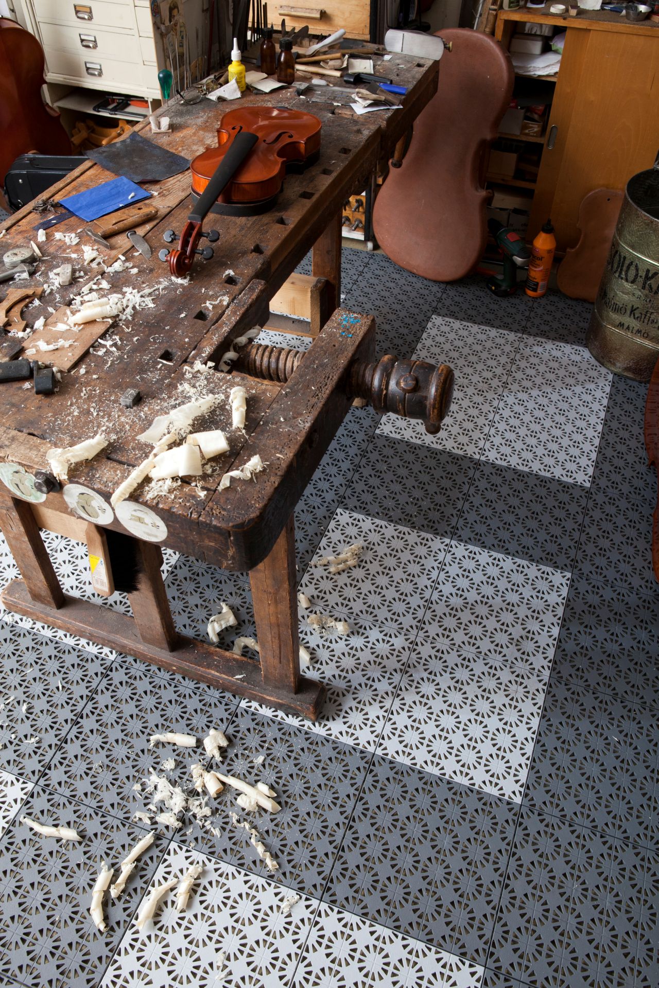 - Upravte dlaždice Mosolut Hestra pomocí pily s jemným zubem, např. přímočarou pilou. Během řezání doporučujeme podlahové dlaždice převrátit (spodní stranou nahoru) tak, aby se řezaly v přímé linii.